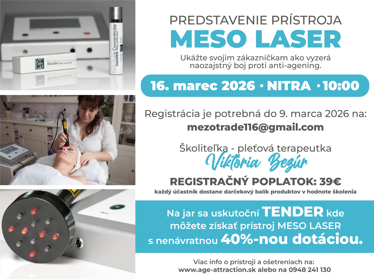 Najnovšia a najúčinnejšia metóda na Slovenku, s ktorou môžete uskutočniť ošetrenia celoročne. Vyskúšajte a otestujte nemecké prípravky AGE ATTRACTION a ošetrenie MESO I LASER.